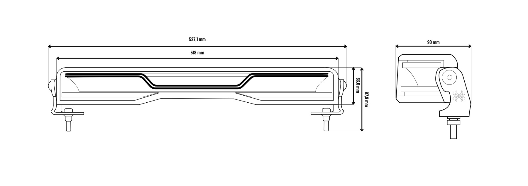 \r\n-Consumo de energia: feixe de máximos de 80 W, luz de presença de 4 W (branca), luz de aviso de 16 W (âmbar)\r\n-Tensão de funcionamento: 12/24 V\r\n-Número de LEDs: 108 no total\r\n-Número de referência: 50\r\n-Aprovações: ECE R10, R65, R148, R149\r\n-Proteção contra entrada: IP69K\r\n-Comprimento do cabo: 50 cm + 50 cm (conectores DT)\r\n-Temperatura de funcionamento: -40 °C a +60 °C\r\n-Material da caixa: AL\r\n-Material da lente: PC\r\n-Dimensões do produto: 527,1 × 87,9 × 90 mm”