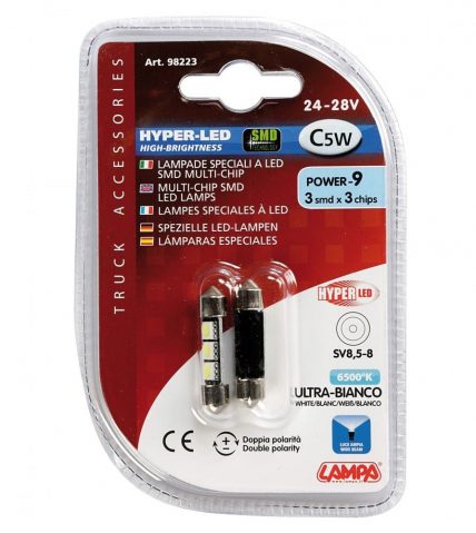 “Blíster con dos bombillas LED C5W 24/28V, con 3 SMD de LED de color blanco por bombilla.\r\n\r\nMedidas 10×39 mm.”