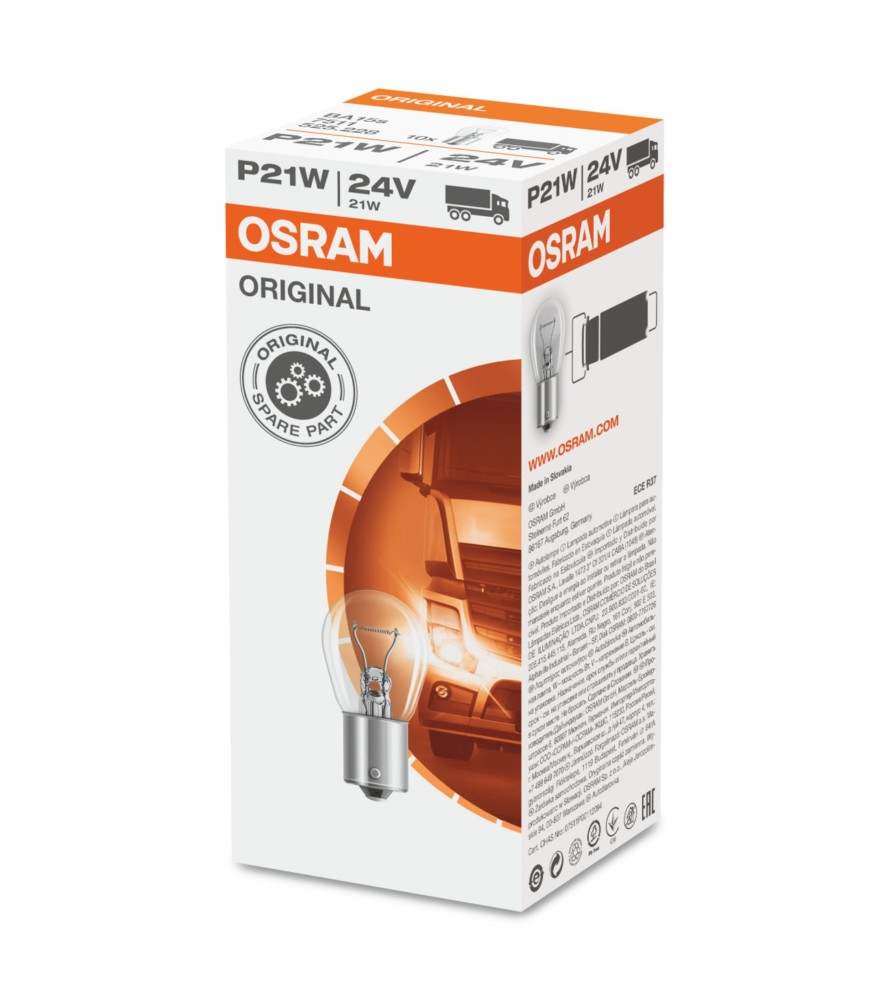 “Caixa 10 Lâmpadas Osram 24V 21W P21W\r\n\r\nOs materiais utilizados na construção de camiões são muitas vezes empurrados para os limites. Os camionistas têm, portanto, de confiar totalmente na qualidade dos vários componentes.\r\n\r\nO desempenho fiável das lâmpadas OSRAM ORIGINAL LINE 24V é a primeira escolha dos camionistas.\r\n\r\nSeguro e fiável.\r\n\r\nQualidade total.\r\n\r\nQualidade OEM\r\nExcelente relação preço-desempenho\r\nUtilizado com sucesso em milhões de veículos novos de fabricantes de renome\r\nBrilho e fiabilidade impressionantes.”