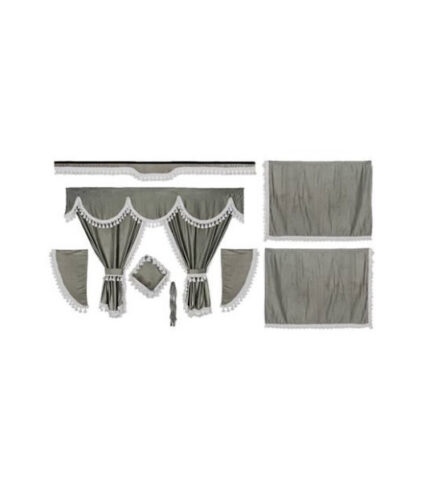 “Juego de cortinas para camión de tela opaca de color azul oscuro, con flecos de color dorado.\r\n\r\nKit completo de cabina, con cortinas para las ventanillas, cortinas de la cama y visera frontal.\r\n\r\nNo incluye ganchos ni roletes para las cortinas.\r\n\r\nTamaño de las cortinas para cabinas normales. No apto para cabinas Scania Top Line, DAF Scape Cab o MAN XXL.”