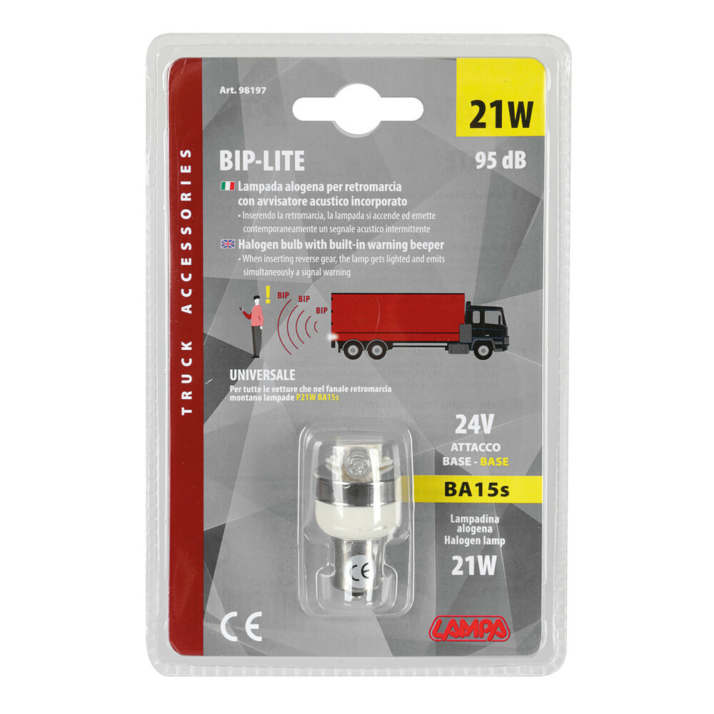 “Lámpara de marcha atrás sonora 24V\r\n\r\nLámpara halógena de 21W con señal sonora de alerta integrada.\r\nEspecífico para lámpara de reversa.\r\nAl engranar la marcha atrás, la lámpara se enciende y emite simultáneamente una señal de aviso (≥95 dB).\r\n\r\nEAN8000692981979\r\nEmbalaje D/Blíster\r\nAltura mm 185\r\nAncho mm 100\r\nProfundidad mm 30\r\nPeso kg 0,035”