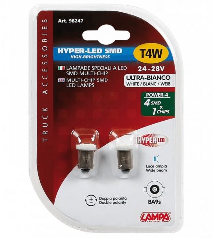 “Blíster con dos lámparas LED T4W 24V, con 4 SMD de LED de color blanco en cada lámpara.”