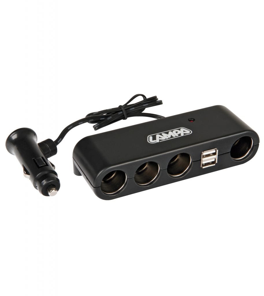 “Enchufe de encendedor de 12/24V con cuatro tomas y dos puertos USB adicionales.\r\n\r\nProtección con fusible.”