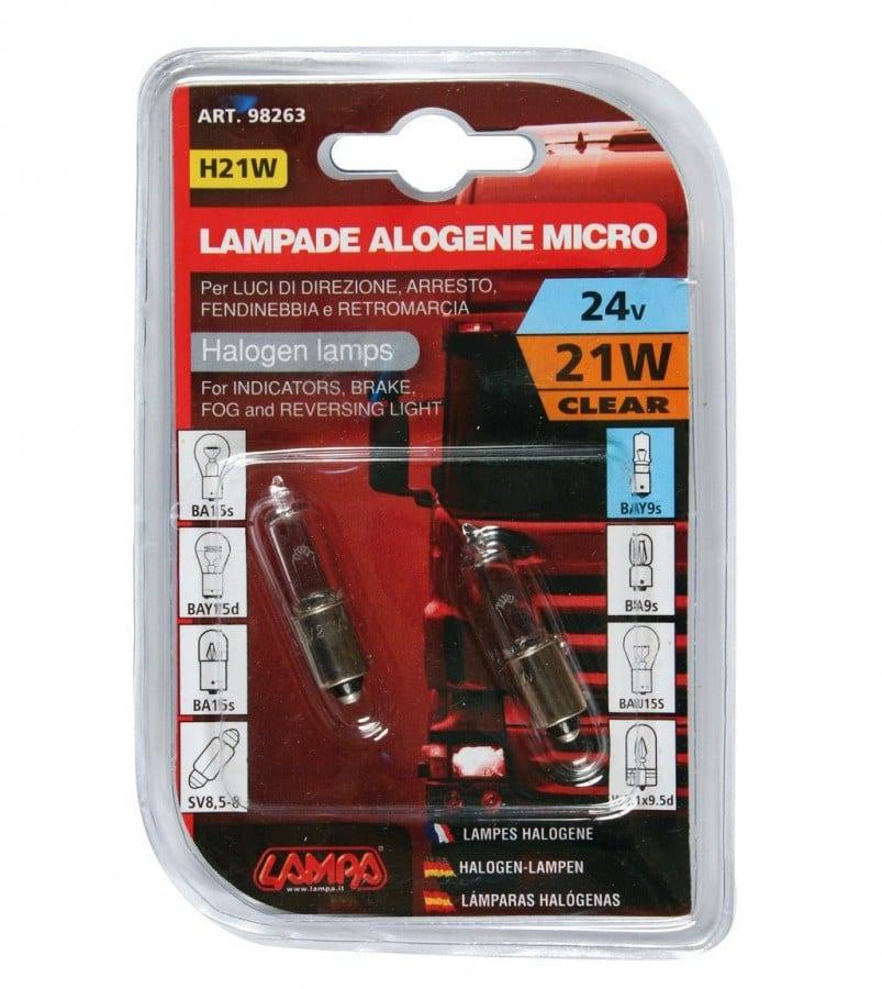 Blister com duas lâmpadas H21W de 24V, com grande qualidade e durabilidade.