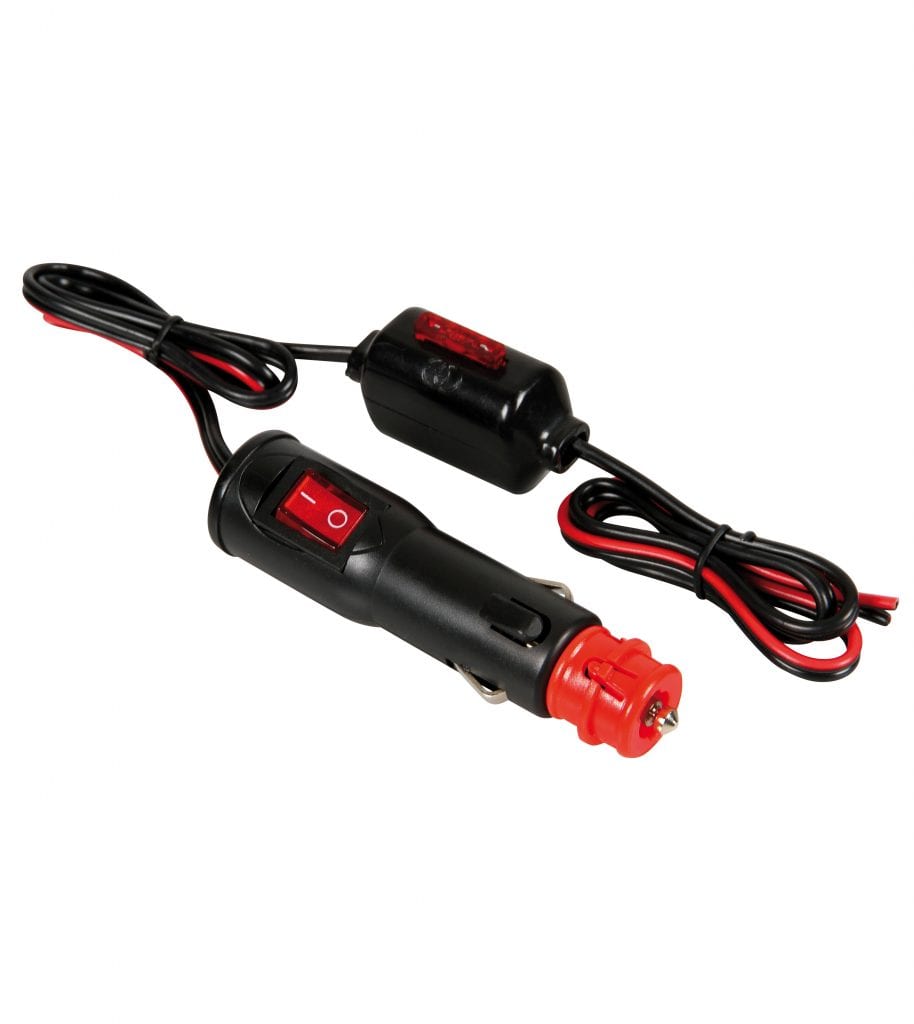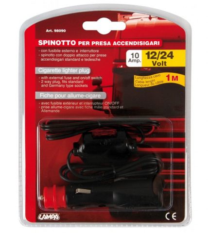 Ficha de isqueiro universal com fusível exterior de 12/24V e botão on/off. Cabo de 100cm e fusível de 10A.
