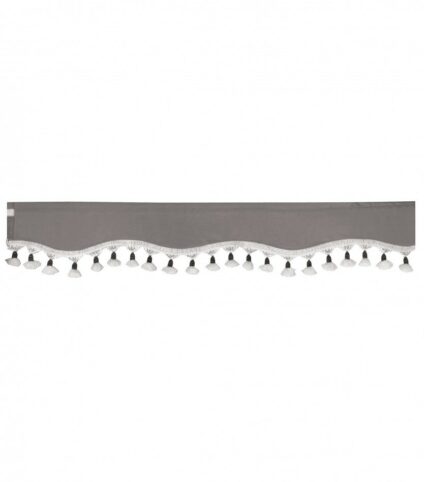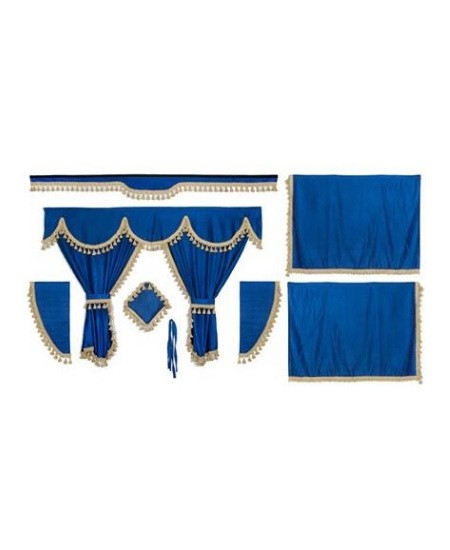 Kit de cortinas para camião em tecido opaco de cor azul, com franjas de cor bege.