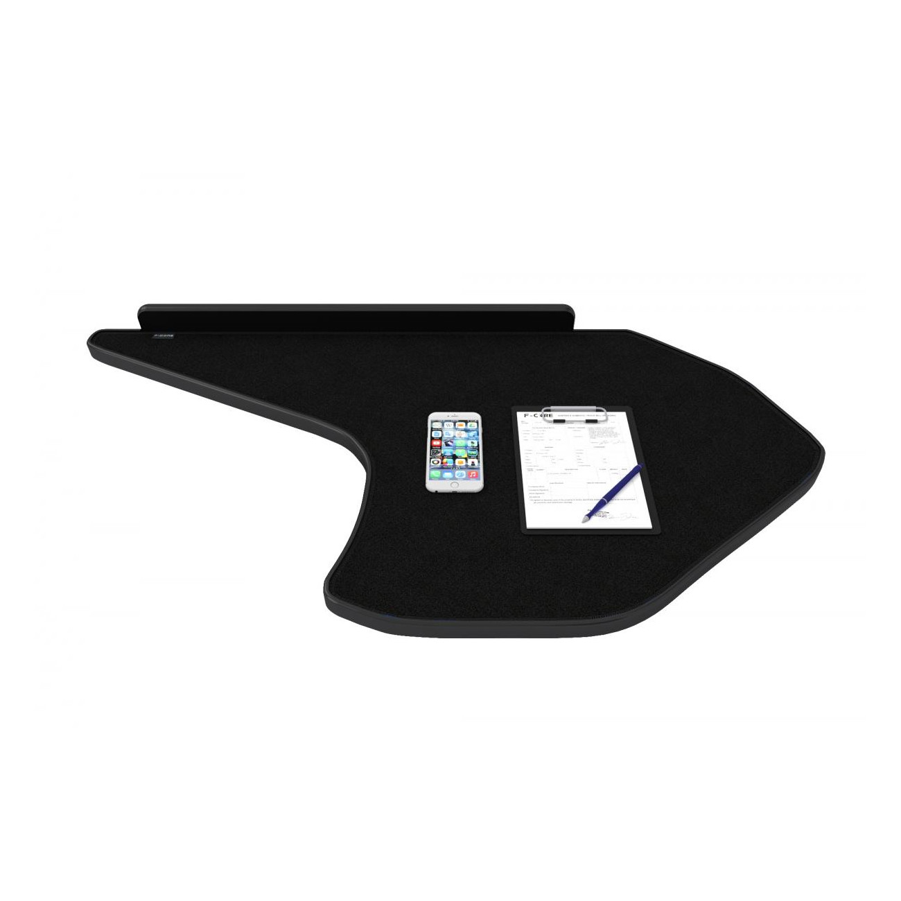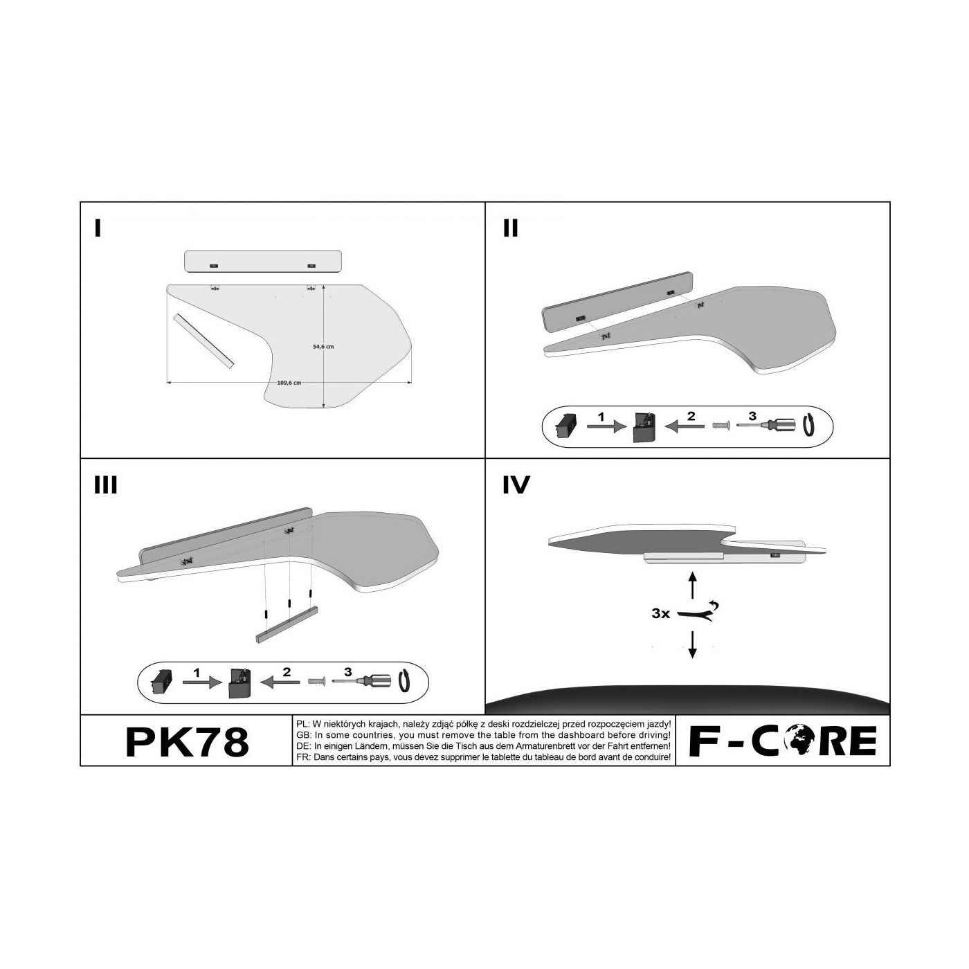 Na caixa está tudo o que o motorista precisa para instalar a mesa: instruções de instalação, velcros, parafusos e chave allen.