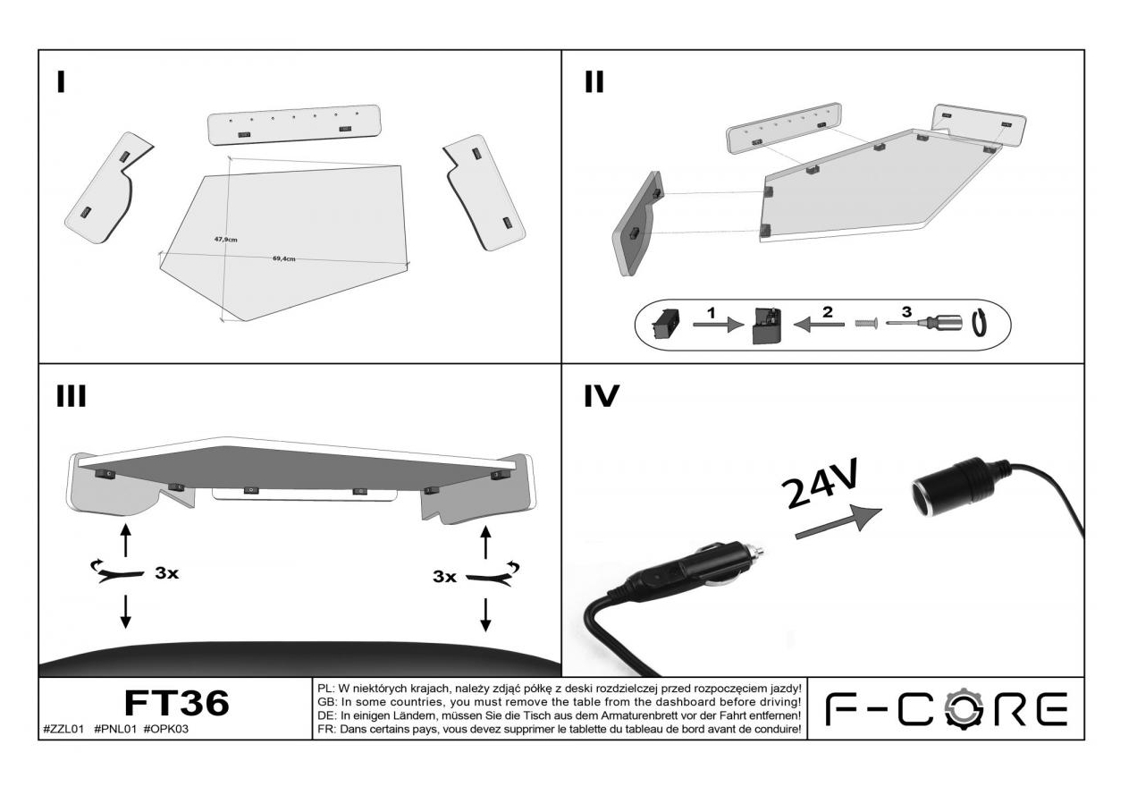 Tudo o que o condutor precisa para instalar a mesa está na caixa: instruções de instalação, velcros, parafusos e uma chave Allen.