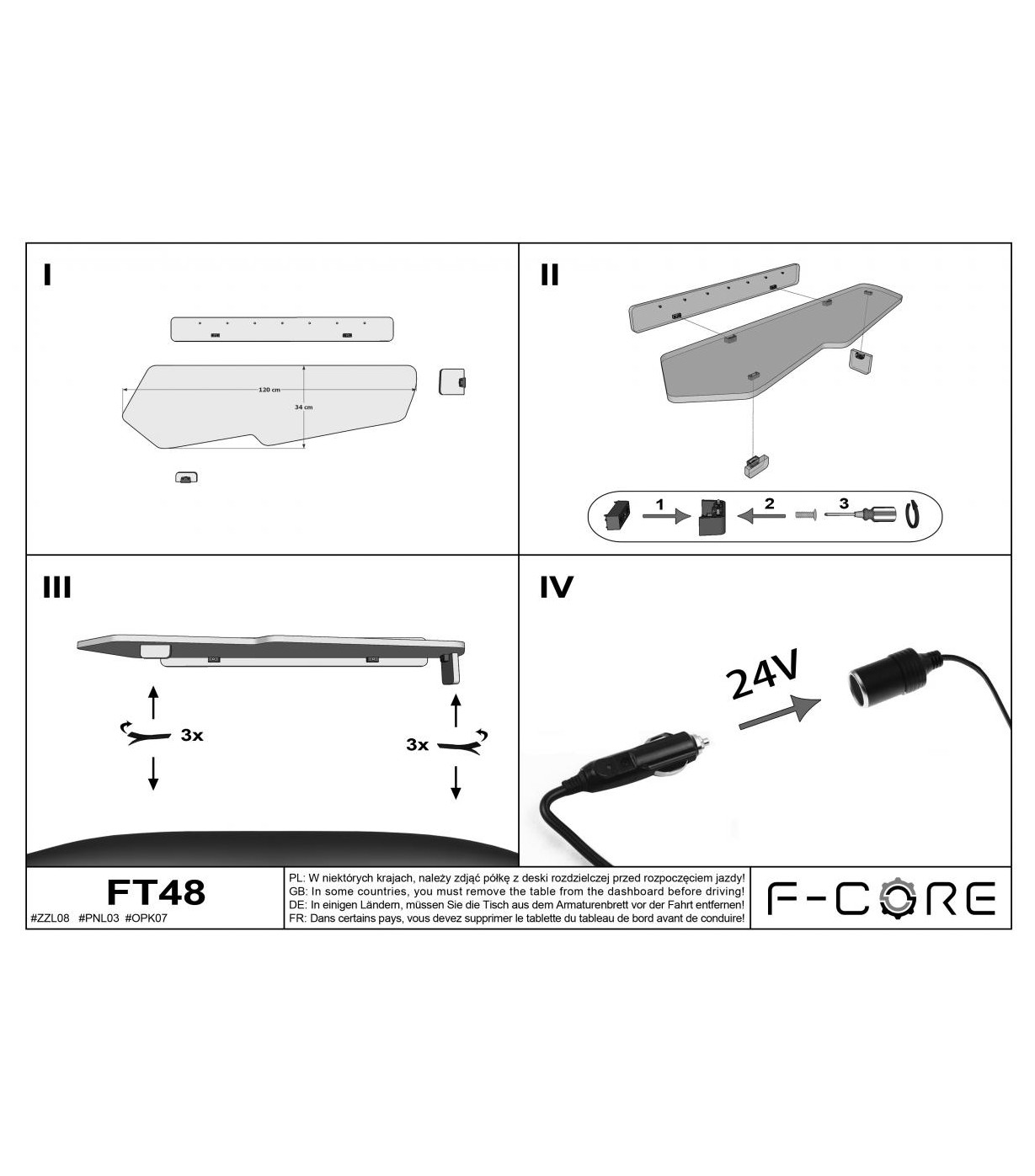 Tudo o que o condutor precisa para instalar a mesa está na caixa: instruções de instalação, velcros, parafusos e uma chave Allen.