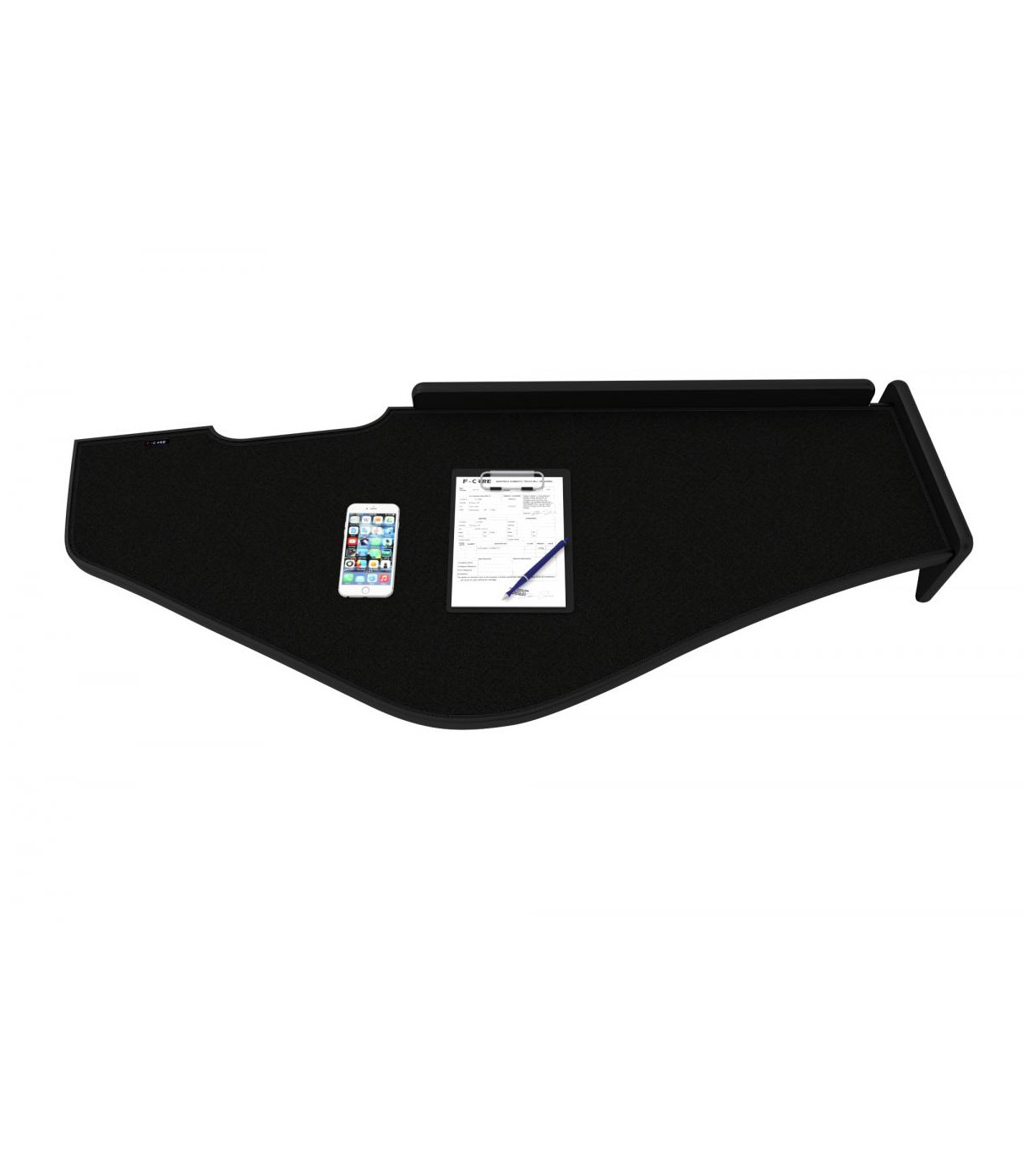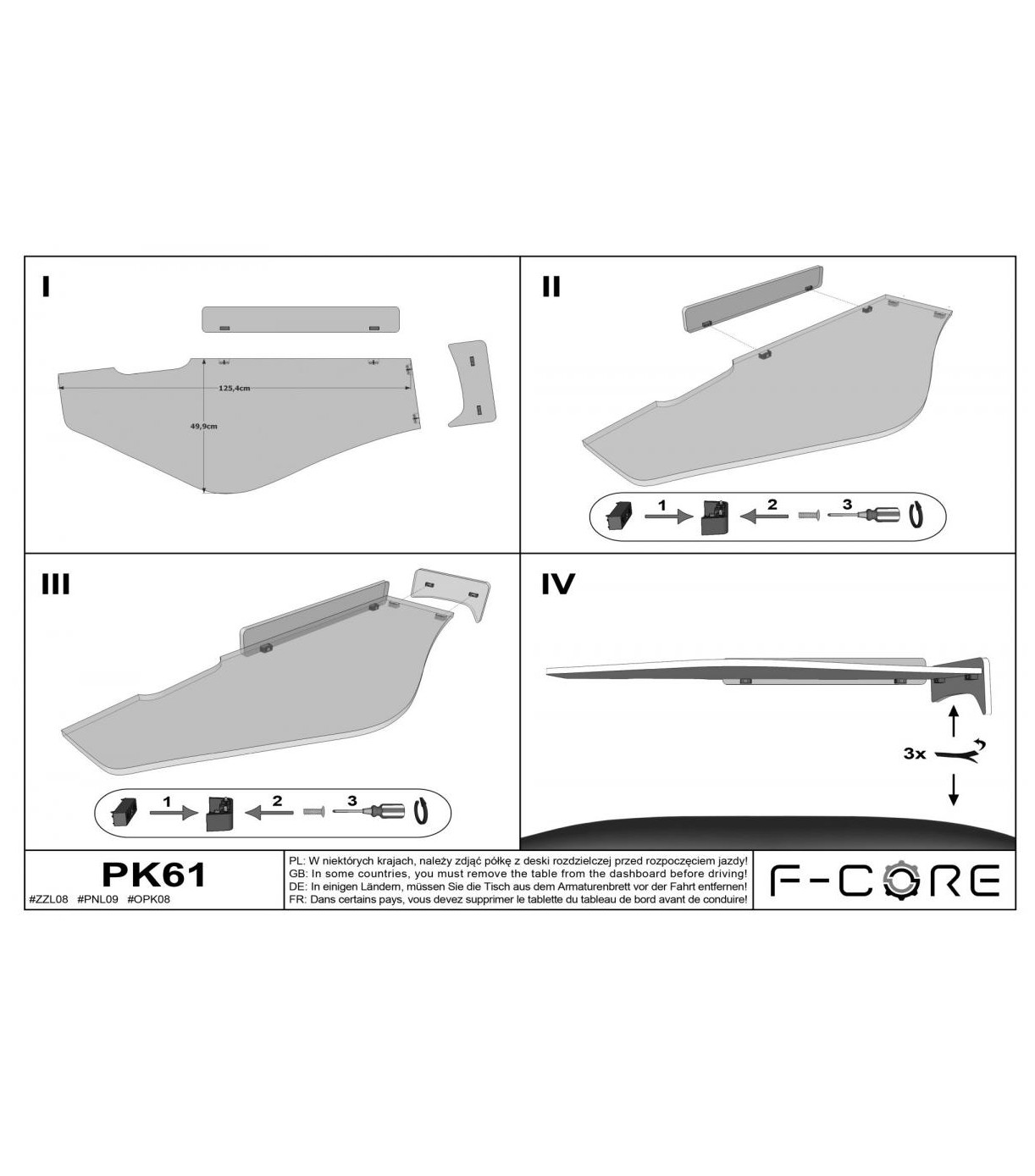 Tudo o que o condutor precisa para instalar a mesa está na caixa: instruções de instalação, velcros, parafusos e uma chave Allen.