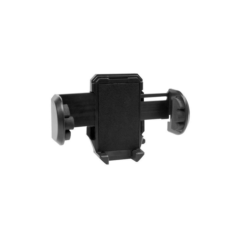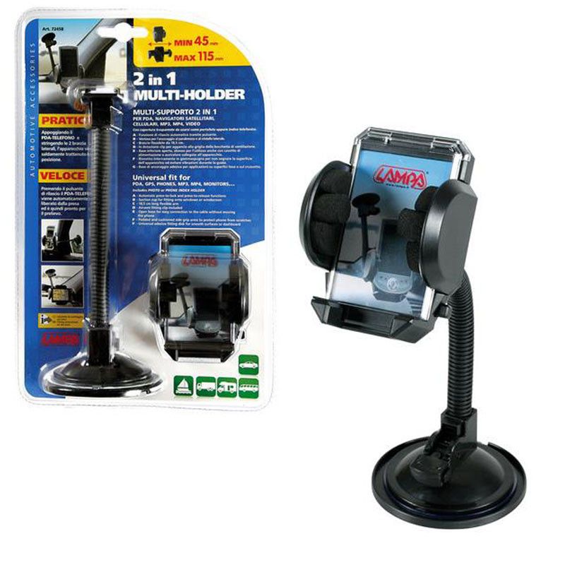 Revestido internamente em espuma de borracha. Adequado para uso com um cabo de alimentação ou fones de ouvido conectados à unidade. Função de liberação automática pressionando o botão. Fixação por meio de clipes para bicos de ventilação ou ventosas para fixação em superfícies lisas. Braço flexível de 18,5 cm. Base adesiva incluída. Extensível para segurar objetos de 45 a 115 mm